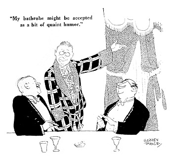Roughly speaking, I think every man and woman should strive to keep on hand the right sort of clothes to permit him or her to go forth without hesitation and enjoy whatever sort of companionship he or she desires. A man, for example, who longs to attend formal dinners where evening dress is imperative should strive to maintain a dress suit, because if his wardrobe is such that, when he takes off his business suit, he has nothing to put on but a bathrobe, he usually feels an innate reluctance to go to the banquet. My own feeling is that if I were confined to those two sorts of garments I would make a bigger hit at a banquet if I wore the bathrobe, but that is only because I have a reputation as a humorist and my bathrobe might be accepted as a bit of quaint humor. It is one I bought in Paris in 1908. Ordinary men, however, such as bill clerks, secretaries of state, presidents of crematories, bankers, and milkmen -- and all women except authors of social-decay novels and free verse -- should try to have on hand a style of evening dress more formal than the huckaback bathrobe if they wish to attend evening functions and feel really comfortable.
