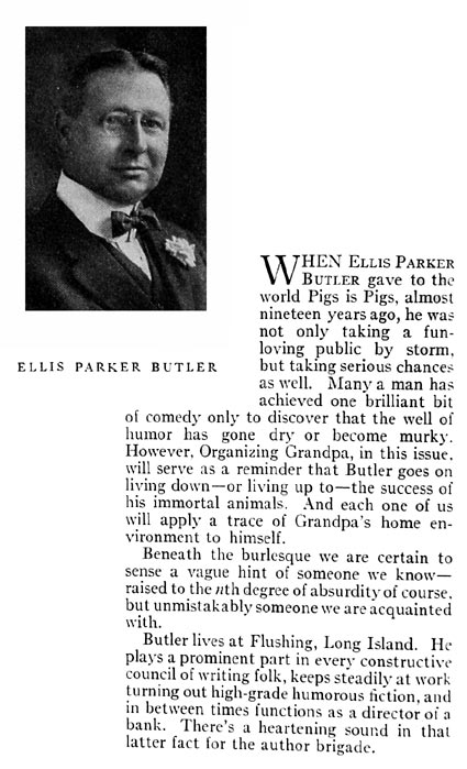 When Ellis Parker Butler gave to the world Pigs is Pigs, almost nineteen years ago, he was not only taking a fun-loving public by storm, but taking serious chances as well. Many a man has achieved one brilliant bit of comedy only to discover that the well of humor has gone dry or become murky. However, Organizing Grandpa, in this issue, will serve as a reminder that Butler goes on living down -- or living up to -- the success of his immortal animals. And each one of us will apply a trace of Grandpa's home environment to himself.