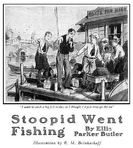 • Target (August 16, 1930)   "Stoopid Went Fishing"   A Jibby Jones story. Illustrated by R. M. Brinkerhoff. Volume XC. Number 33. "A Paper for Boys" "Continuing the Sunday School Advocate" Copyright 1930 by the Methodist Book Concern, 420 Plum Street, Cincinnati OH.  [HARPER]
