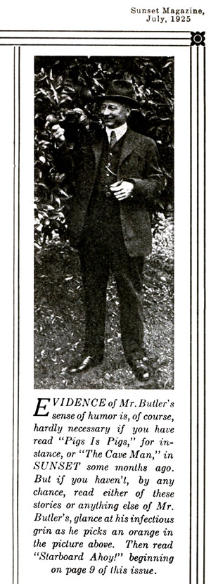 Evidence of Mr Butler's sense of humor is, of course, hardly necessary if you have read "Pigs Is Pigs," for instance, or "The Cave Man [sic]," in SUNSET some months ago. But if you haven't, by any chance, read either of these stories or anything else of Mr. Butler's, glance at his infectious grin as he picks an orange in the picture above. Then read "Starboard Ahoy!" beginning on page 9 of this issue.