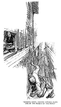 He moved the ladder toward the edge of the roof, and then carefully raised it on end. A moment it stood upright, and then he allowed it to fall toward the Umholt cottage. It fell with a great clatter, striking the edge of the Umholt eaves, and then rebounded into the yard below, where it hung half suspended from the fence. Dan clung to the roof like a cat on a clothesline. The noise awakened the Umholt family, and before Dan had removed the ladder from the pickets Mr. and Mrs. Umholt issued from their kitchen dour.